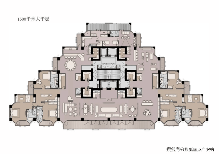 最豪气的还是这个整层一户建面约1500㎡的大平层户型。它南向面宽达60米,有14个阳台!