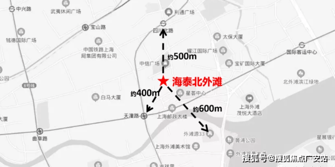 从地理坐标看,海滩北外滩直线距离外滩源仅600米,步行可达外白渡桥、上海邮政大楼等海派文化地标;