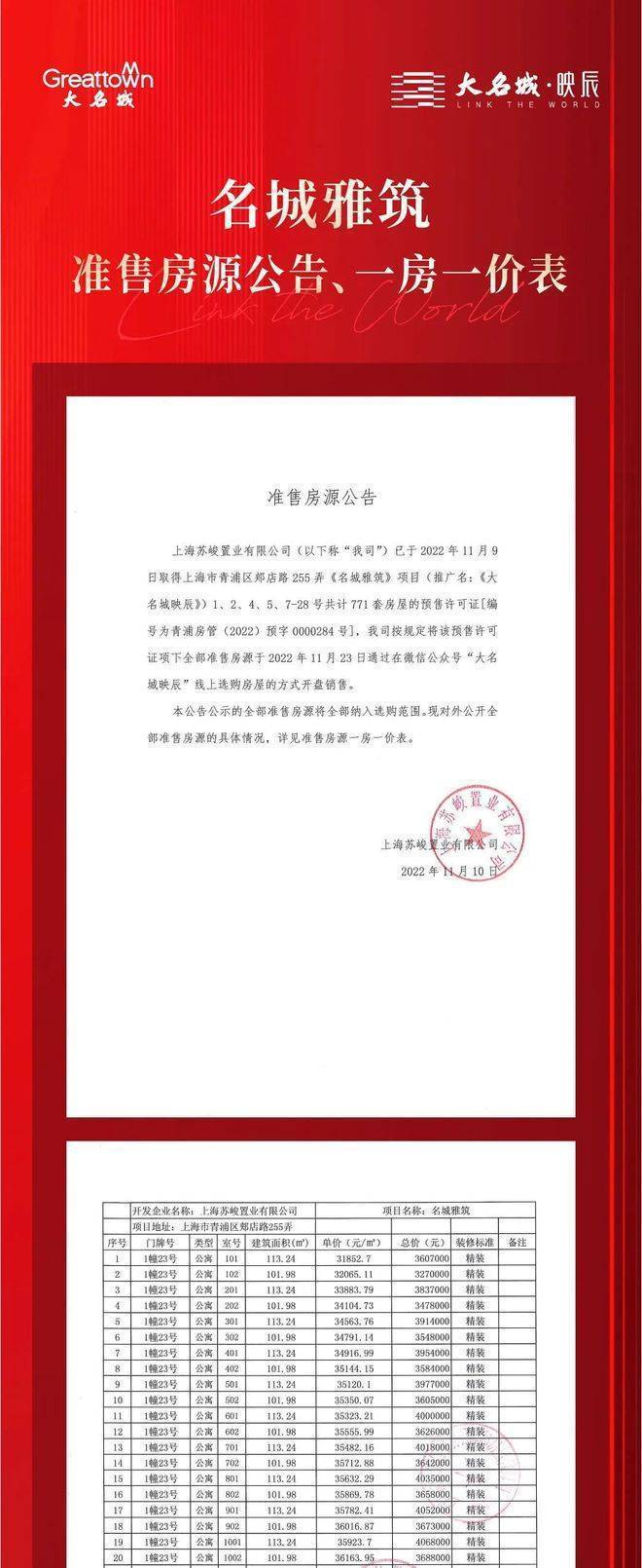 在2021年12月上海第三批集中供地中,大名城以底价摘得青浦区重固镇郏店路南侧44a-01地块,成交总价13.5亿元,成交楼板价16000元/㎡,房地联动价3.48万/㎡,即如今的大名城·映辰。
