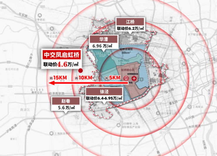 目前,与中交·凤启虹桥仅一站之隔的芳乐路站TOD旁的一块宅地,联动价已提升至6.96万/㎡,徐泾单价同样是直逼7万/㎡,没有600万以上预算,根本拿不下!