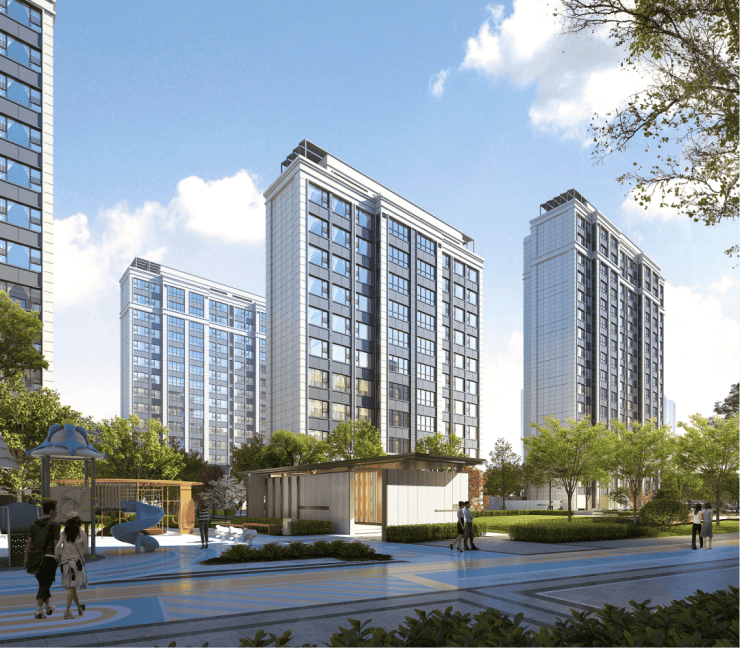 通过园林中曲径通幽的设计手法,布置景墙设计,引人入胜。社区内打造大树聚场、儿童乐园、阳光草坪、健身跑道等多个功能空间,依托架空层构建出更多的互动空间,扩展社区内的活力活动场域,为居者营造更多幸福生活的场景。