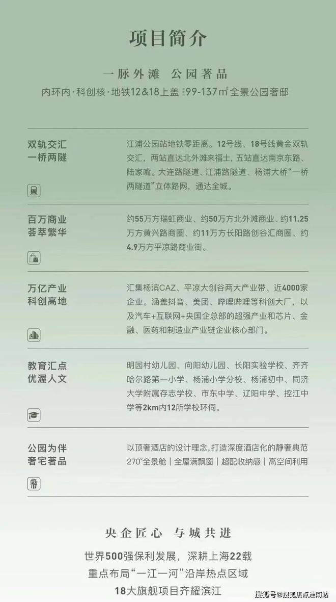 保利外滩启PARK77售楼处电话:400-8787-740【预约☎】保利外滩启PARK77,是大连路总部集群、长阳创谷、杨浦滨江产业带这三大产业共同的芯,凭借极近距离和优越区位,成为三大产业区人才居住优选之地,也是项目未来价值保障。