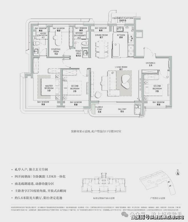 3、南向四开间,面宽约15.5m,独立餐客厅,南北通透