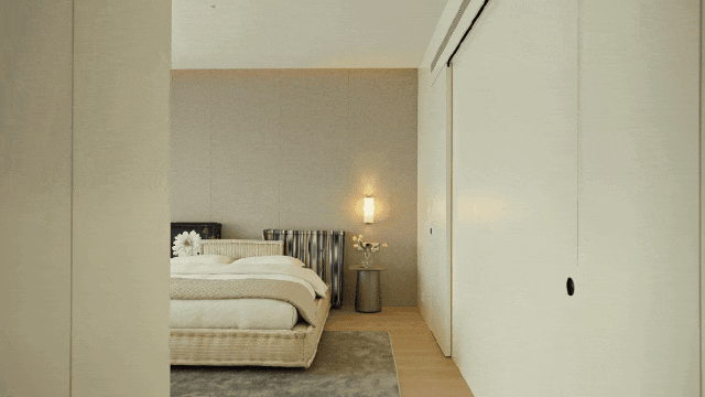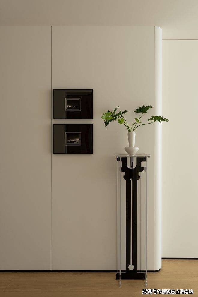 作为入户第一幕,玄关以极简姿态开启生活叙事,素净墙面如天然画布。清透支架托举着素白花瓶,植物姿态俏皮延展,成为连接户外与生活的温柔过渡。