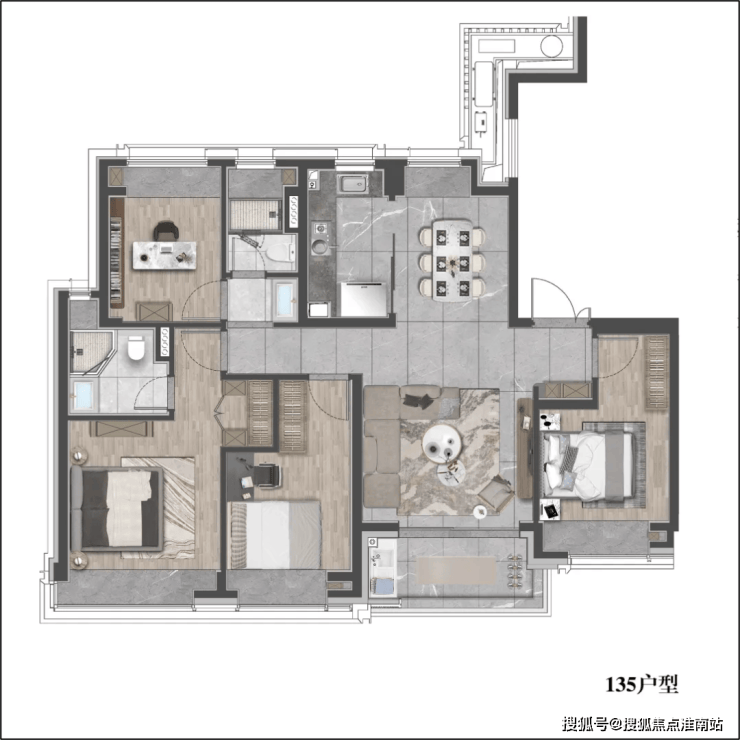 该户型贴合当代人居生活习惯,既适合三口之家小太阳家庭,也可以是三代同堂,每个人都能拥有独立空间。