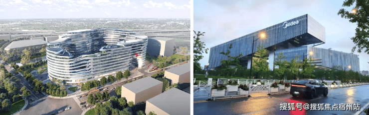 安踏总部效果图(左)、美的总部实景图(右)