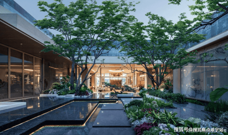 沉浸式下沉式庭院空间以水为墨,营造出了具有流动艺术氛围的自然空间,水幕墙、叠水水景、植物相互交融渗透,带给业主度假酒店般的松弛感。