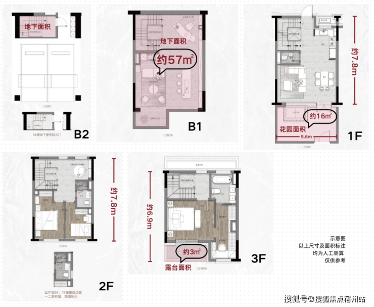 地下面积预测约57㎡;1、2F轴线进深约7.8m;3F轴线进深约6.9m;