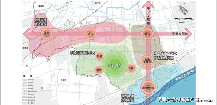 亭枫发展轴: 依托亭枫高速、亭枫公路以及规划中的南枫公路串联枫泾镇、朱泾镇和亭林镇,发展成为贯通北部地区的东西向经济发展轴,以生活功能为主,同时聚焦古镇文化旅游、服务业和居住等功能。