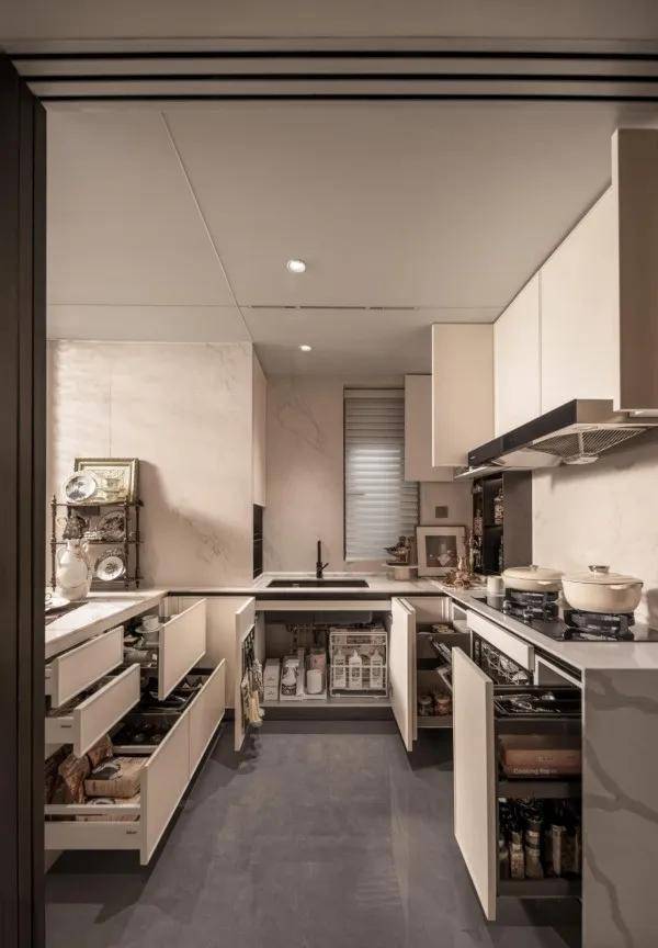 厨房更是堪称美食达人的天堂,集成一系列多功能调味拉篮、定制谷物抽屉等,收纳有序,油盐酱醋间的分类放置烦恼一次性得到解决,琐碎繁杂不再。