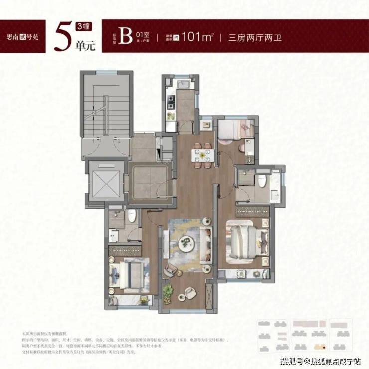 建面约100-101㎡户型,拥类独立电梯厅,无连廊+飞机户型南北通透。