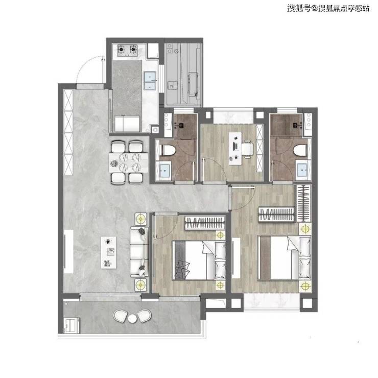 该户型做到了三开间朝南+超大面宽横厅+主卧套房设计+卫生间干湿分离+南北通透,功能性和尺度感完美结合。