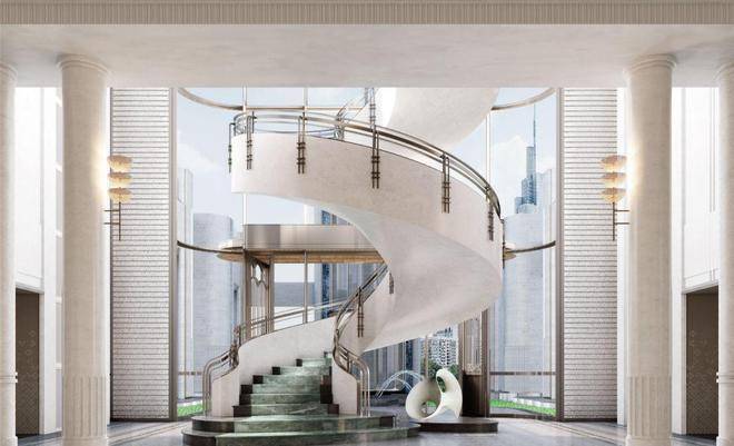 整体的归家落客尺度设计复刻了《周礼·考工记》中记录的建筑最高礼遇“面阔九间”的设计,同时,在归家酒店式落客空间,以山茶花元素为源定制了“海派漩心”艺术装置,将文化之美深入建筑的深处。