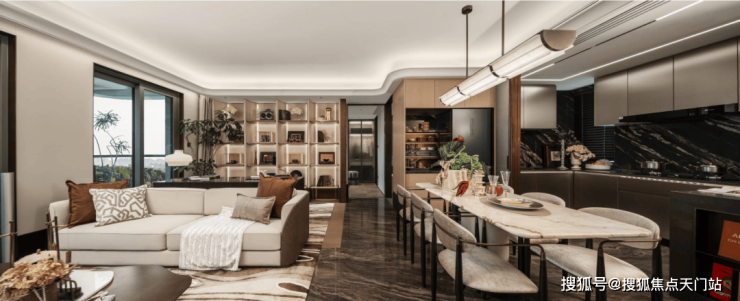 吊顶采用 一体化大平顶加回型吊顶设计,并且在四个角均匀做了 圆弧处理,让整个空间感更加和谐圆润。