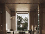 整座大堂墙面延续爱马仕灰大理石,顶部水晶灯和墙面壁灯均为全铜打造,大堂接待台采用产自意大利山脉的普拉达绿奢石一体打造而成。