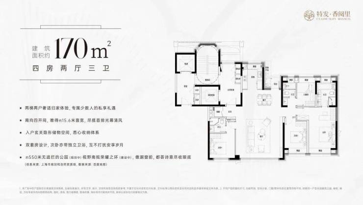 建面约 170㎡四房两厅三卫,占据公园首排,将园景、城景尽收眼底。约 15.6 米面宽、南向四开间设计,采光通风俱佳。南向双套房设计,更好的居住体验;主卧套房配备步入式衣帽间与豪华主卫,配备浴缸精装交付,提供超舒适居家体验。