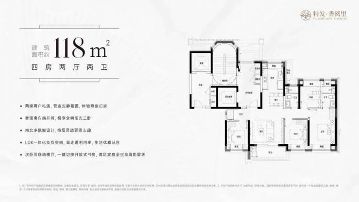 建面约 118㎡四房两厅两卫,两梯两户的私密配置,归家仪式感拉满。次卧与客厅之间采用非承重墙设计,可按需打通,改造为超大横厅,无论是家庭聚会还是朋友派对,都能轻松驾驭。