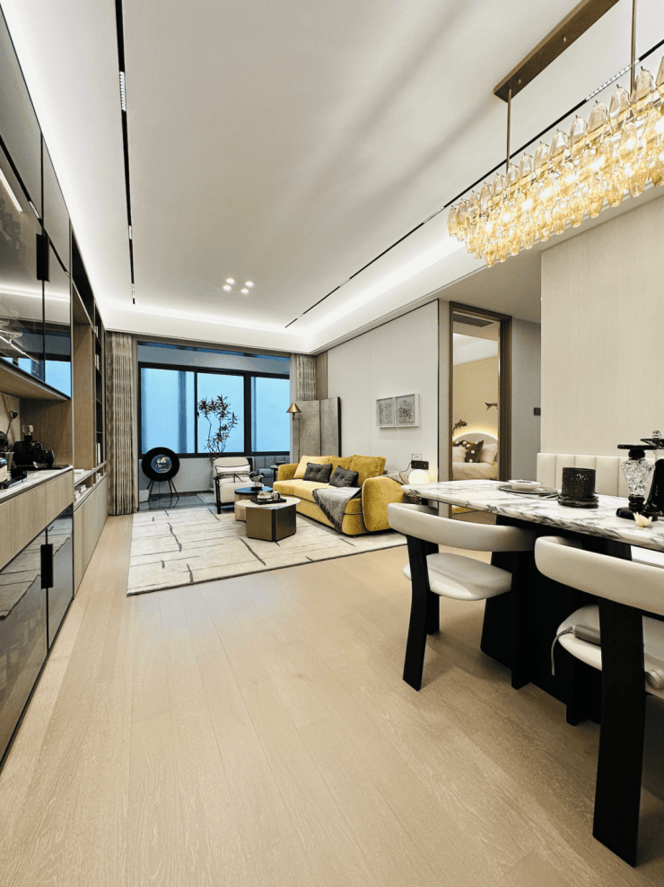 约160m归家轴,四进礼遇空间,给到满满的归家仪式感!一进城市落客广场,二进迎宾吧台,三进迎归景观,四进入户大堂,高低起伏的景观流线,指引业主漫步归家。