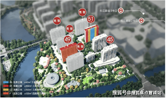 景观设计:打造约 20 万方的滨水双公园,包括约 14 万方潮玩艺术公园、约 3 万方体育公园和 1300㎡的波普艺术滑板公园等。社区内部采用 “一心两轴三门” 的归家动线,有四大景观组团,设置了成人健身、童趣乐园等众多空间。