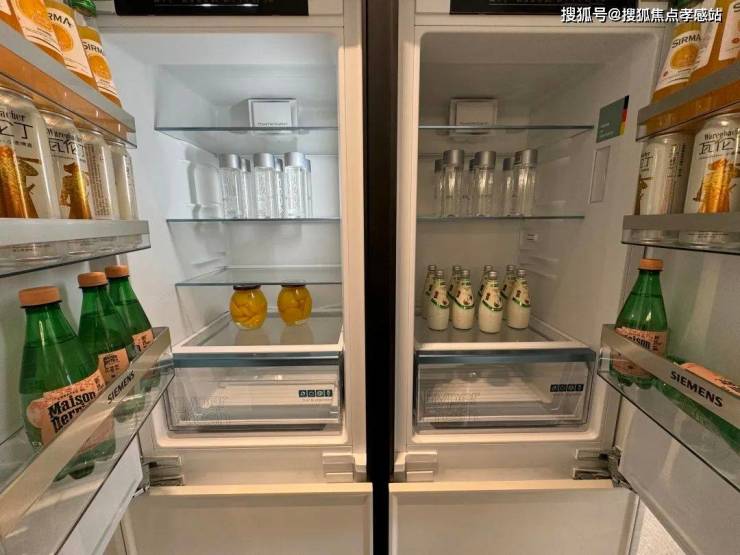 厨房是带岛台交付的U型厨房,厨具品牌为西门子四件套,另外还有双开门冰箱,线性凉霸、科勒单槽。