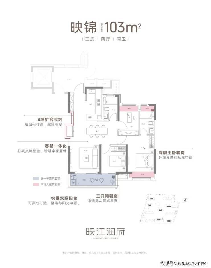 建筑面积约103㎡三房两厅两卫,不失为改善家庭的首选。其中边套户型,映江润府的主卧套房 做了 270°环幕飘窗, 实现无与伦比的采光通风和视野享受,类比于千万级豪宅的体验!
