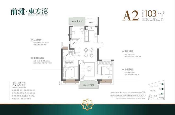 户型建筑层高3.1-3.15米,无连廊,双阳台配置。其中建面约103平户型2梯2户,其余一梯一户。