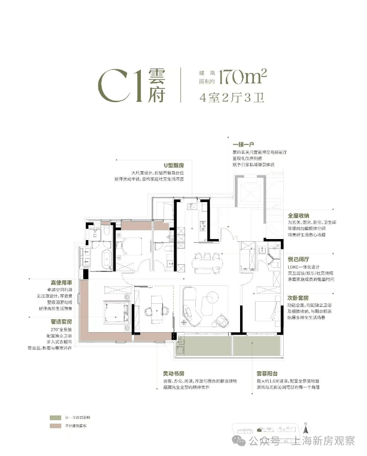 随后推出的 170㎡“悬浮全景舱”,直接引领上海高端户型革新—— 南向 15.8 米四面宽让每个空间都享阳光平权,深 U 型厨房预留西厨岛台,约8.35 米双阳台兼顾功能与情绪价值,双套房 + 270° 全景窗 + 三卫设计,更将 “新平权主义” 落到实处,让每位家庭成员都有私密空间;
