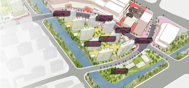 项目联通城市轨交、快速直达主干道和开放街区步道,打造三重立体路网体系,构筑组织多样性,实现快耍慢活的生活节奏,并借此串联起TOD大城里的商业、公园、街区、广场、地铁、酒店,六大场景。