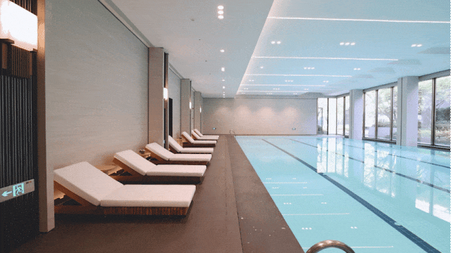 在下沉式景观庭院两侧,是不同的邻里空间。一侧是邻里中心,涵盖恒温泳池以及宽阔的健身房空间。当业主锻炼时,不被空间局限。透过落地窗,可以一边挥洒汗水,一边尽情欣赏庭院中的美景。