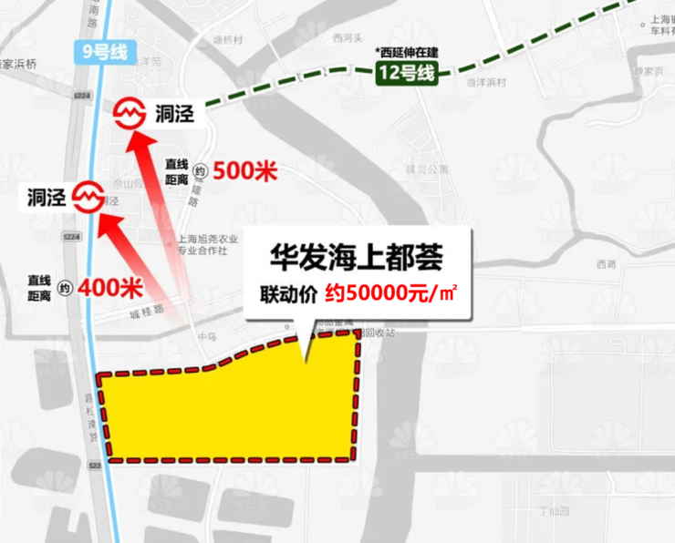 交通方面,该地块距离9号线洞泾站,直线距离约400米,距离在建地铁12号线西延伸段,直线距离约500米。地铁12号线西延伸段,是松江继9号线的第二条轨交地铁线,预计2027年年底通车。自驾可从嘉松南路、沈砖公路等主干道到达各处。