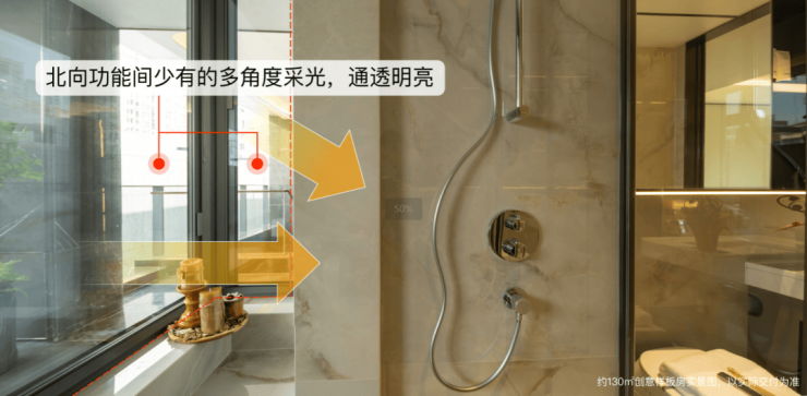 相比常规户型只是全卧飘窗布置,Bund98户型不仅厨房带飘窗,主卧和两个卫生间更带双侧采光的270度飘窗,总共七个飘窗,飘窗不计入建筑面积,附赠远超常规户型。
