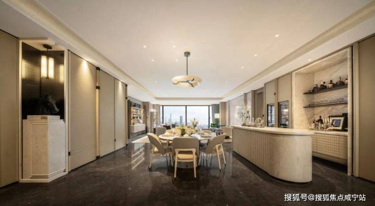 开放式厨房+岛台+客厅+超1.8米进深阳台,通铺设计。整个LDK区域是一个完整的家庭社交中心。客厅背景墙的奢石、立体弧线造型——这种“烧钱”工艺,才是真豪宅该有的样子。
