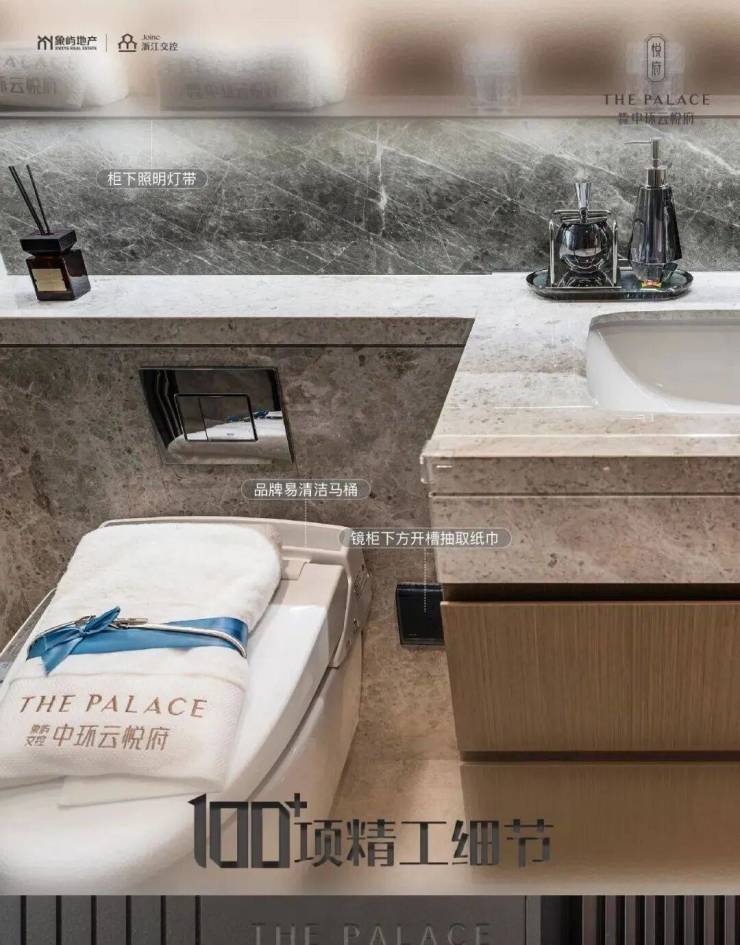 卫浴空间同样精彩,采用高仪的台盆、龙头、智能马桶、淋浴花洒等,主卫创新定制“美妆冰箱”,满足业主对美妆、护肤用品冷藏的需求,足见开发商对成本的舍得。