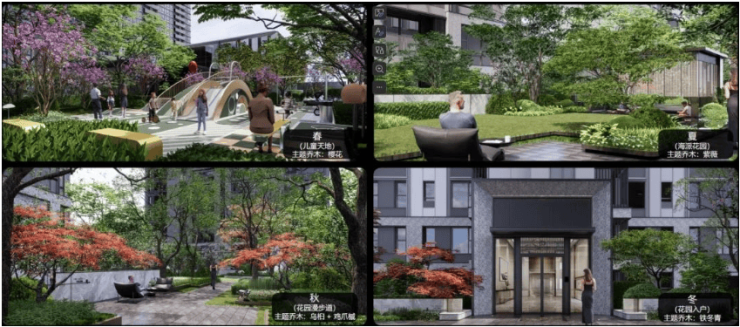 多花园:沿归家轴线设计了悠闲童梦花园·、静谧私语花园、精致乐享花园、邻里会客花园、活力健身花园等。花园种植了像金桂、红梅、晚樱、榔榆等植被,常绿与落叶植物组合搭配,三季有花,四季有景。