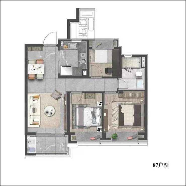 建面约87㎡3房,做到了三开间朝南设计,整个户型几乎没有浪费面积。实现空间节约、居住升级等美好体验。