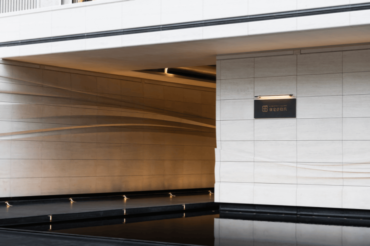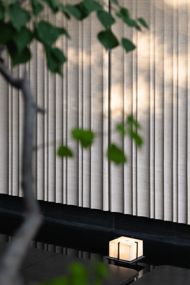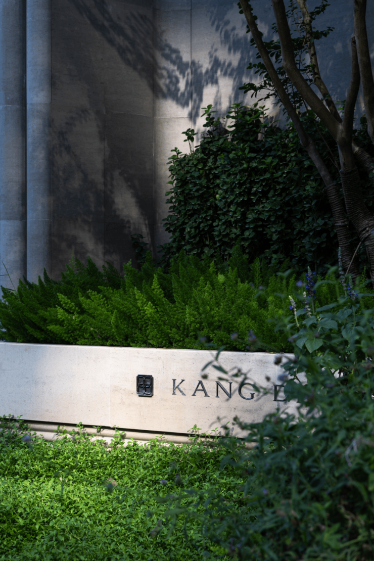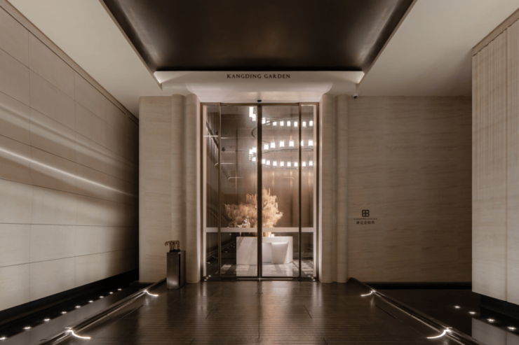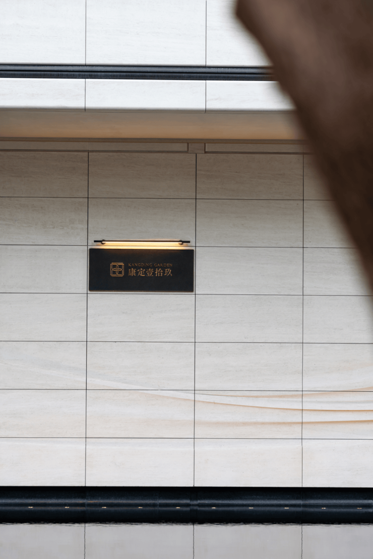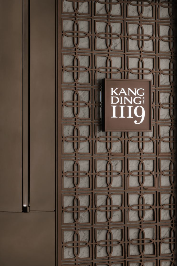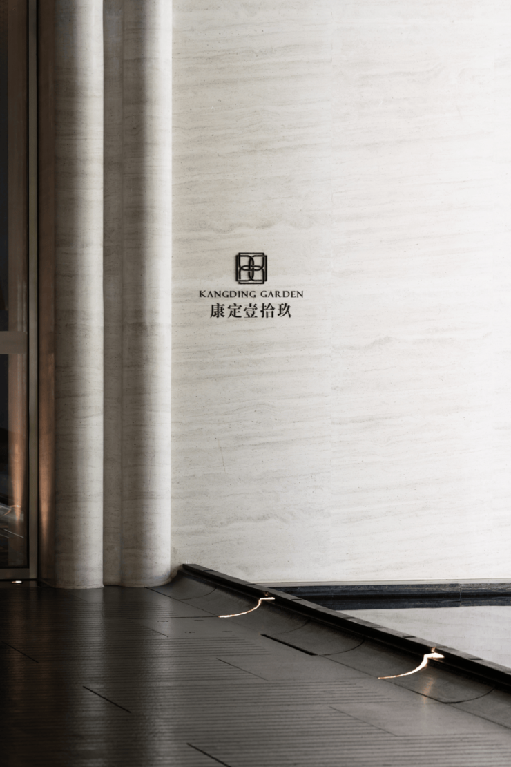 茂密的法国梧桐过滤了大都市的喧嚣,「康定壹拾玖」的现代玻璃幕墙上倒映着路旁的老建筑,新与旧在此碰撞,演绎着独树一帜的风华逸韵。入口处“揉石成缎”的石墙上,标识如同一枚时间琥珀镶嵌其中。浅色的石材墙面温润素雅、古铜色的标识辅以锤纹、浮雕及镶嵌工艺,使整个平面呈现出丰富的层次:线条起伏流转、光影明暗交错。「康定壹拾玖」的稀贵,都凝练在这方寸之间。