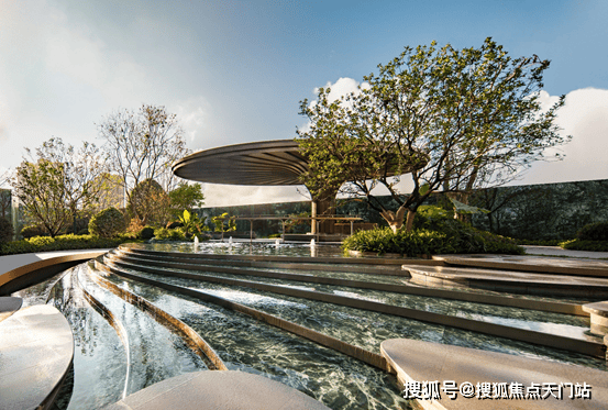 12级叠水、2座树池、9步水上汀步,运用六重造景手法打造近500平中央水景。