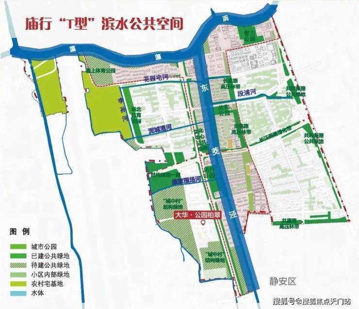 庙行镇的宜居基因,根植于“水绿共生”的规划哲学。以”蕰藻浜,东茭泾“T字滨水公共空间为骨架,以”四座公园,千亩绿地”为肌理,着力构建无界共融的“一T双环”公园城市格局。