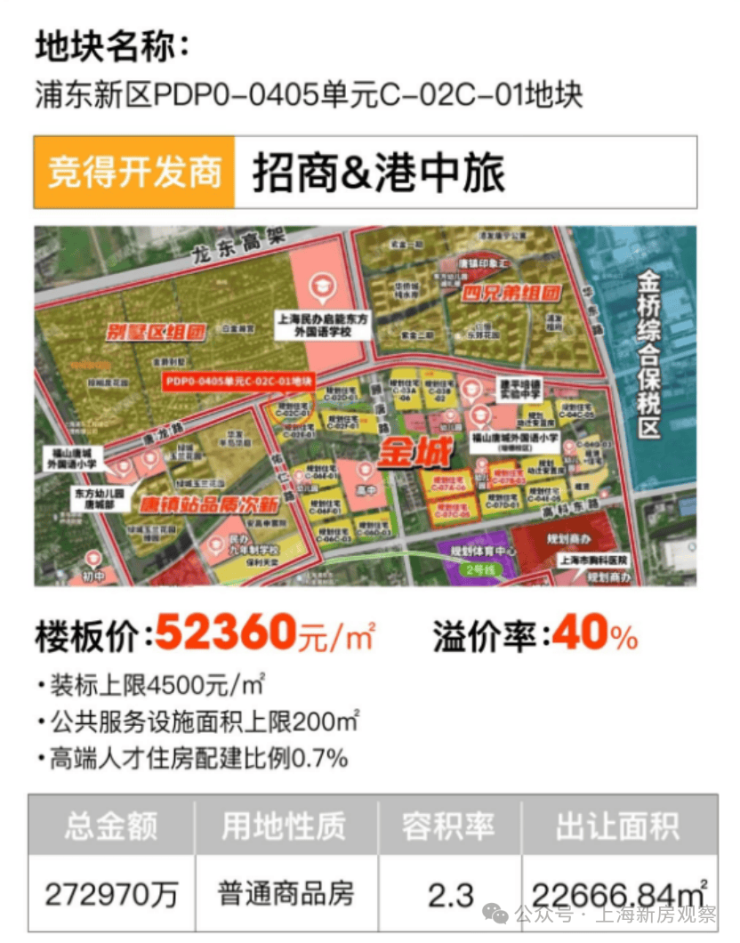2024年11月28日,在上海第七批次土拍中,保利发展以楼板价44008元/㎡、溢价率26.6%拿下浦东新区PDP0-0405单元C-05C-04、C-05D-03地块,装修标准2500元/㎡。