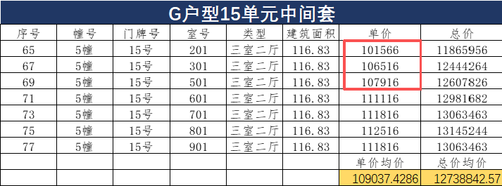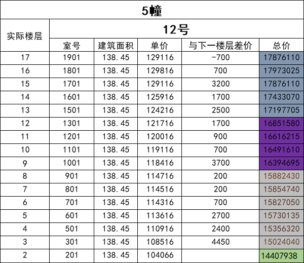 从5楼开始,单价呈现小幅阶梯式上涨,直至实际楼层14-15楼出现一次较大幅度跳价,这主要考虑到高楼层拥有更开阔的视野与居住舒适度。