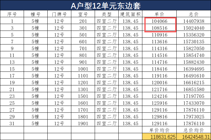 东边套139㎡户型的定价逻辑则有所不同,各楼层之间存在更为明显的价格差异。