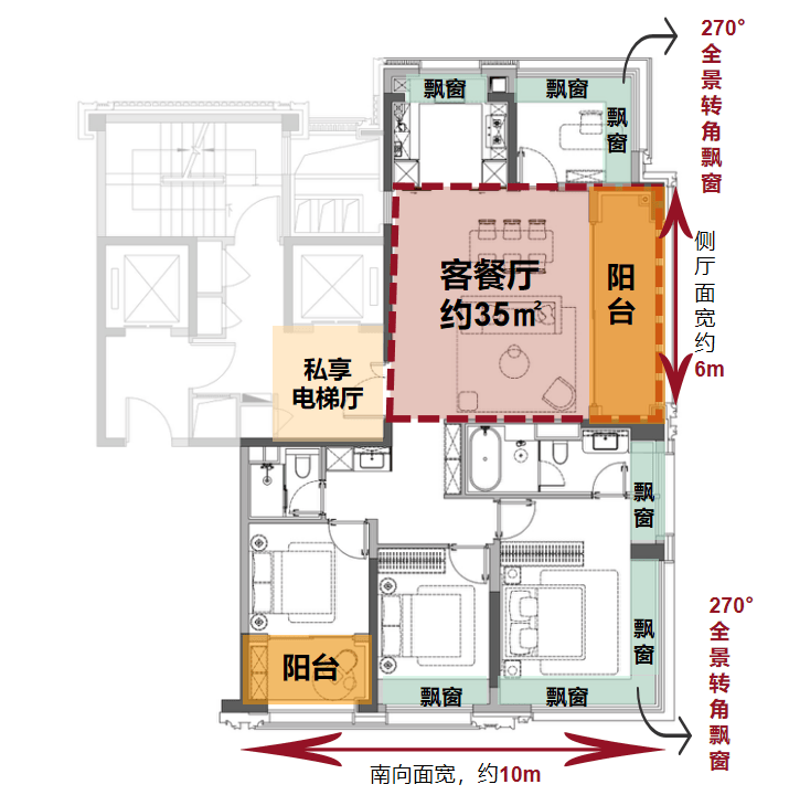 保利誉滨江✅✅售楼处电话:400 - 1010 - 064✅✅这个户型南向面宽约10米,设计上不走寻常路,打造环岛式侧厅,侧厅面宽近6米,联动同面宽多变阳台,形成约35㎡的开放式社交核心场域。因为是边套,所以既拥揽内庭院园林的全景视野,又为家庭聚会与日常互动延展出阔绰从容的空间,尽彰大宅气度与生活温度。