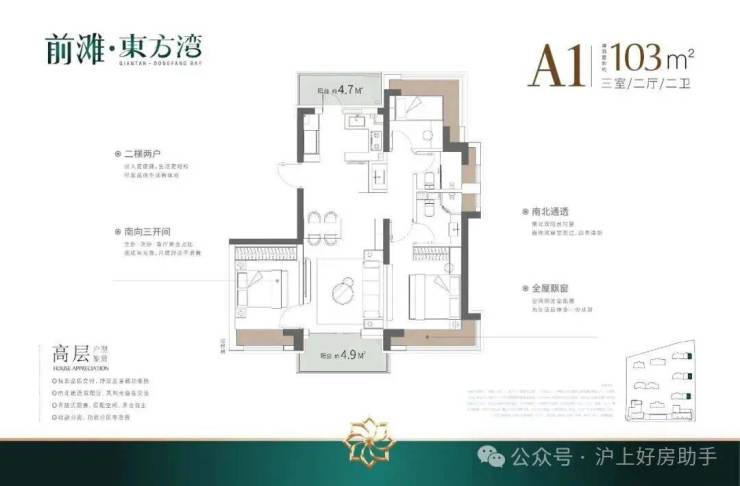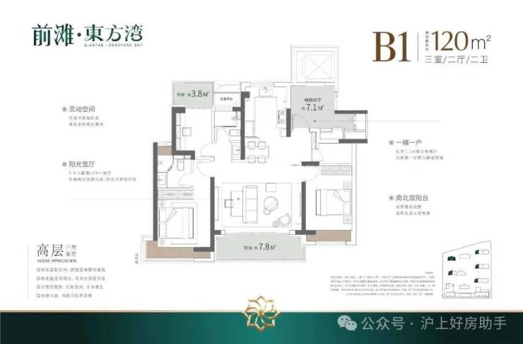 建面约120㎡大3房预计主力总价在900-1050万,一梯一户设计+约6.7㎡私享电梯厅+南北双阳台,质价比拉满!