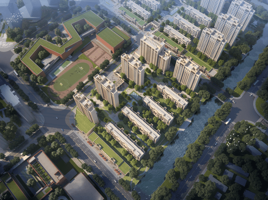 整个区域以九宫格的布局展开,涵盖了住宅+商业+教育配套,项目继承经典海派的建筑风格,通过外立面层次的打造和立面细节的打磨,使得小区外观更有现代感。