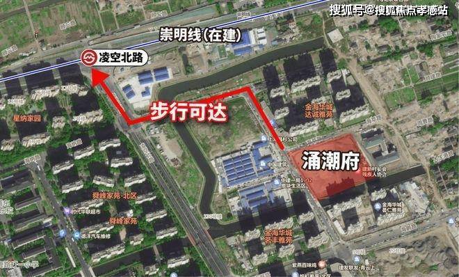 项目距离崇明线(在建)直线约600米,这个距离恰到好处,既不会受到轨交噪音的直接影响,也能做到步行可达。