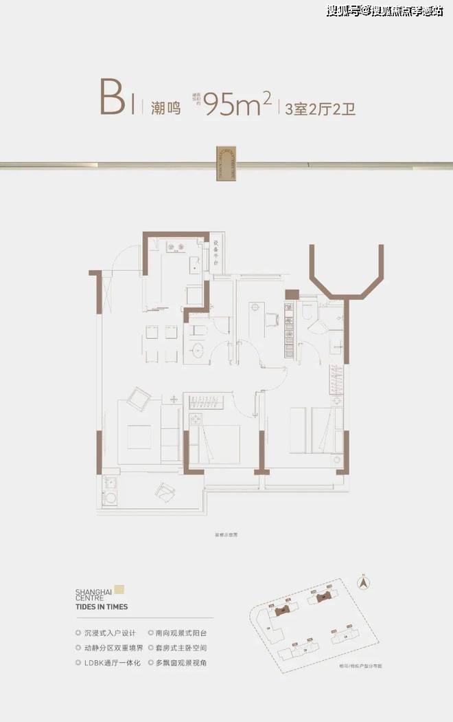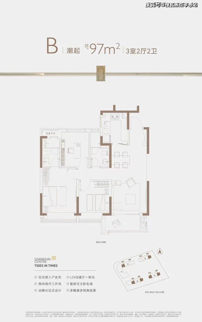 在格局上,户型三开间朝南+动静分离,室内通风、私密性俱佳。