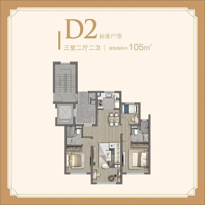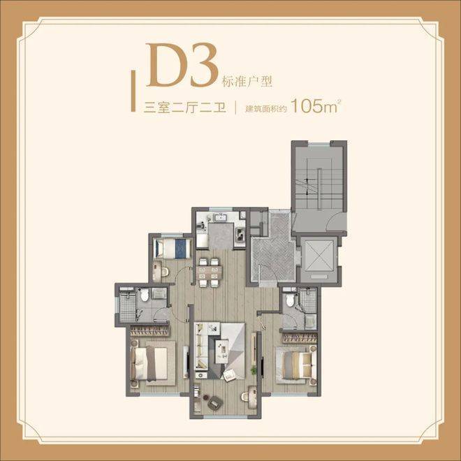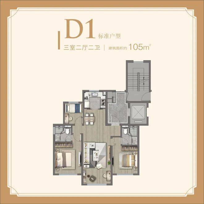 从户型设计看,建面105㎡的3各户型都做到了“双南套房”。