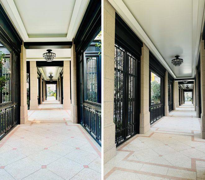 公园道社区地面很多都是用采用石材铺就的,且达到毫米级铺装工艺。