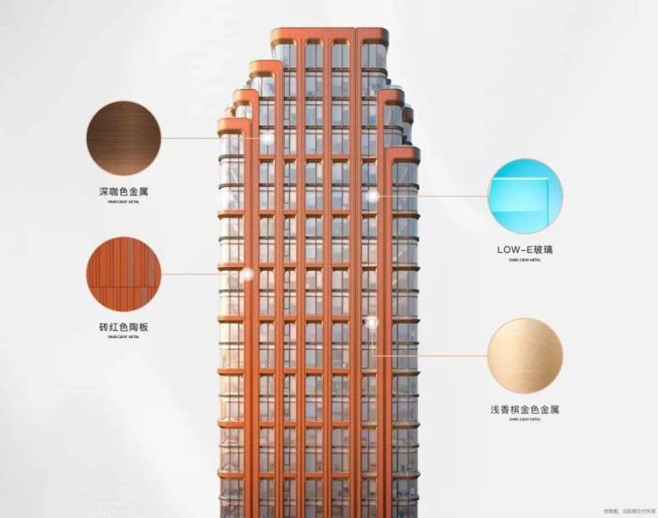 立面主体选用了陶板材质,陶土经过高温烧制后呈现了上海标志性的砖红色,搭配深咖色、浅金色金属线条勾勒,现代建筑的挺拔感和海派风情的色彩感相融合,形成独特的城市地标与封面,昭示性极强!