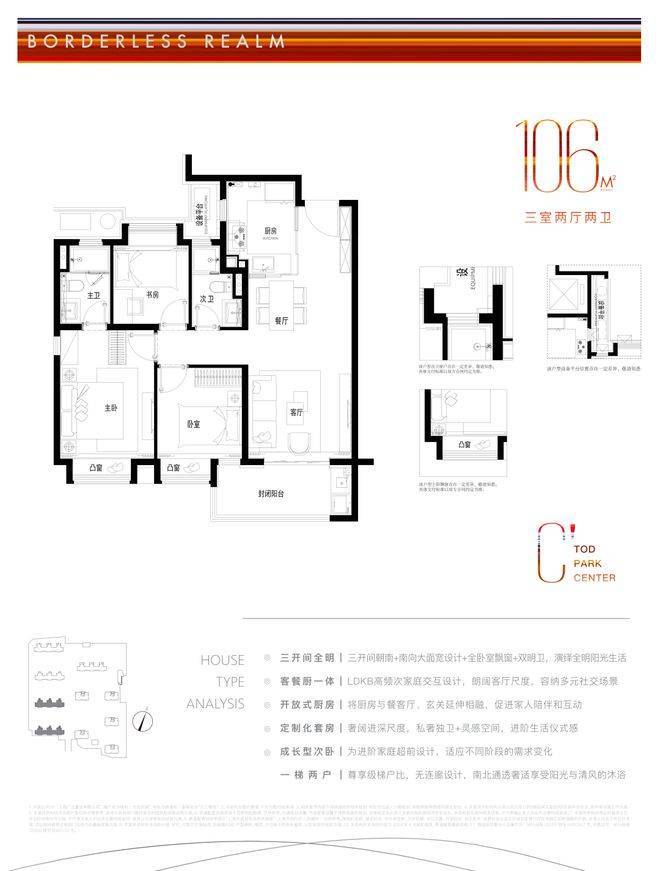 只有可生长的空间,才能适配成长家庭。建面约106㎡三房两厅两卫,一梯两户无连廊,不仅得房率高,而且私密性更强。